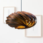 Die Symmetrie der Veneria Hängeleuchte ist von ihrem Ursprung inspiriert, der Natur. Auch hier finden sich fast überall spiralförmige Anordnungen in der Fibonacci-Folge. Ihre breiten Eichenholzlamellen werden von etwas weitläufigeren aber schmaleren Eichenholzstreifen umgeben. Das so entstehende Zusammenspiel aus inneren und äußeren Streifen in Kombination mit Licht und Schatten setzt die Maserung der Veneria Hängeleuchte besonders in Szene. Die Komposition der beiden Lamellen lässt die Hängeleuchte filigraner & eleganter erscheinen.