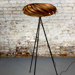 Unsere Stehleuchten der Kollektion 'Veneria' aus echtem Holz holen in Kombination mit dem schwarzen Metall Tripod das Beste aus deinen vier Wänden heraus. Das gemütliche Licht, welches durch die Holzlamellen hindurch abgegeben wird, sorgt für eine angenehme Atmosphäre zum Wohlfühlen. Besonders für Wohn- oder Schlafzimmer ist diese elegante Stehleuchte perfekt. Das einzigartige Design des Lampenschirms, welches in ihrer symmetrischen Anordnung von der Natur inspiriert ist, sorgt für ein warmes, passives Licht. Die breiten Streifen aus Holzfurnier werden im Inneren von schmaleren Streifen aus dem gleichen Holz umgeben, diese Komposition lässt die Leuchte filigraner und eleganter erscheinen. Eingeschaltet kommen besonders Struktur und Farbe des Eichenholzes sehr effektvoll und wunderschön zur Geltung. Die Stehleuchte 'Veneria' ist ein nachhaltiges Designprodukt, welches in Köln von Hand gefertigt wird. Sonderanfertigungen können gerne jederzeit angefragt werden, dafür kannst du unser Kontaktformular nutzen.